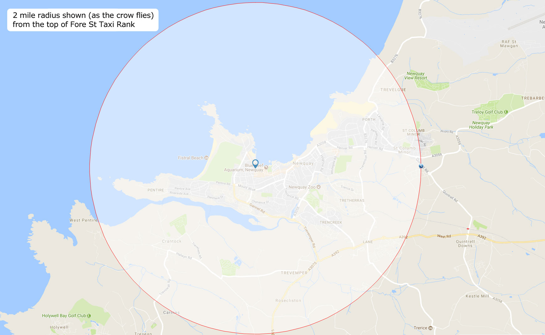 Here are a couple of maps with set mileage radiuses from Sailors Taxi Rank on Fore St, Newquay, in order to give a good idea of distances (as the crow flies of course) when thinking about jounrey costs.